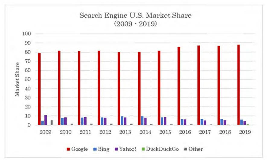 [4] “94. The creation, maintenance, and growth of a general search engine requires a significant capital investment, highly complex technology, access to effective distribution, and adequate scale. For that reason, only two U.S. firms—Google and Microsoft—maintain a comprehensive search index, which is just a single, albeit fundamental, component of a general search engine.