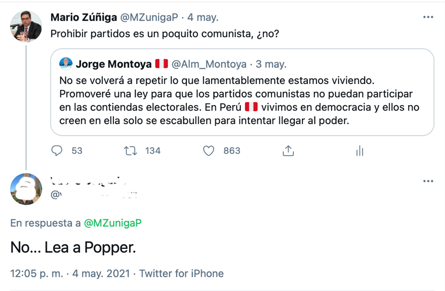 La semana pasada, en un intercambio en redes, me mandaron a leer a Popper, al haber insinuado yo que no sería muy democrático («un poquito comunista») prohibir que existan partidos comunistas, luego de que ello fuera propuesto por Jorge Montoya, ex candidato a la presidencia y virtual congresista electo por Renovación Popular.